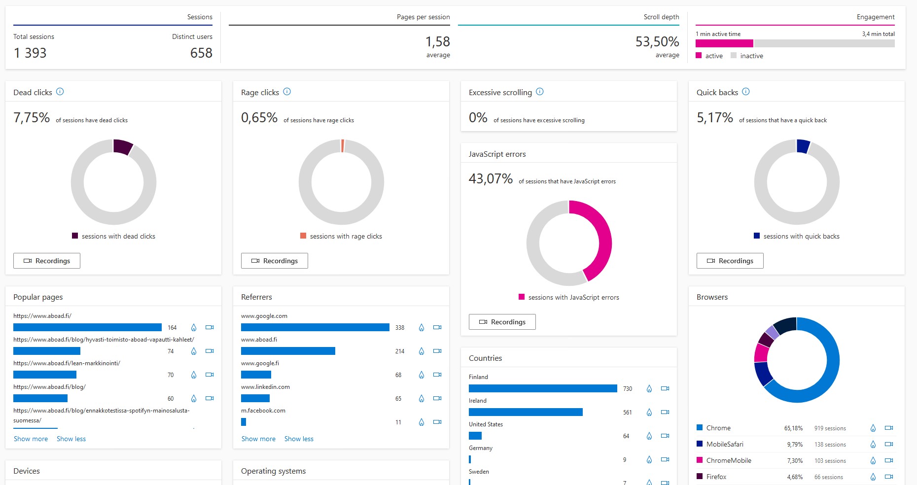 Vaikka Clarityn ominaisuudet menevät päällekäin niin Hotjarin kuin Google Analyticsinkin kanssa, ei siitä ole näiden korvaajaksi. Se on parhaimmillaan täydentäessään perusanalytiikkaa, ja tarjoaa lisätietoa muun kerätyn analytiikan tueksi.