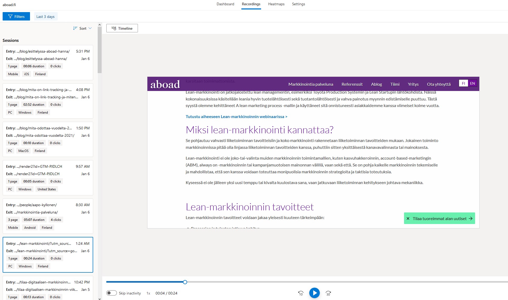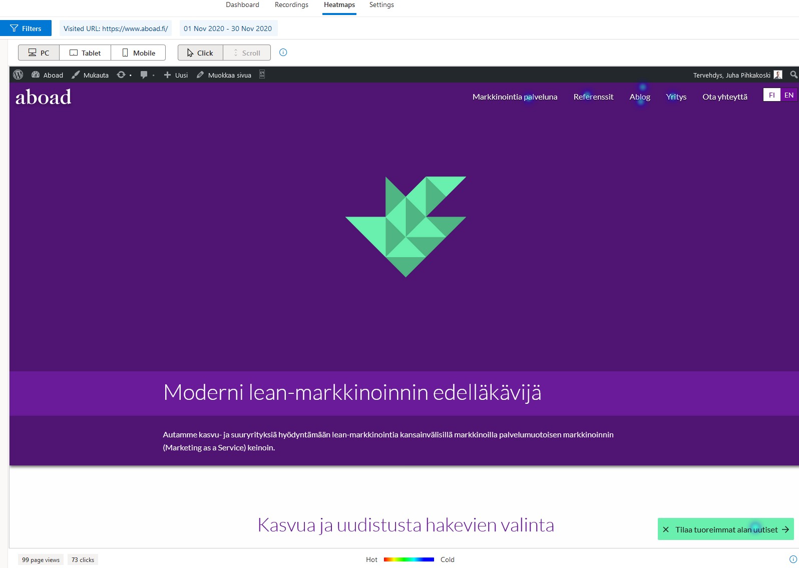 Lämpökarttojen osalta tilanne on vähän heikompi. Tällä hetkellä niissä näkyvät vain klikkaukset tai painallukset. Vieritysten seuranta ei ole vielä toiminnassa, mutta on tulossa myöhemmin. Lämpökarttoja voi tarkastella kolmen eri laitteen kokoisena: PC, tabletti ja puhelin. Nämä menevät tietysti sen mukaan, millä laitteilla istunnot on tehty.