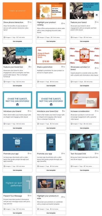 Mallipohjien avulla voi luoda videoita, joiden pituudet ovat 6,15 tai 16 sekuntia, siis varsin sopivia vaikkapa mainontaan Youtubessa. Näistä valitaan mieluisa mallipohja, johon syötetään halutut tekstit, kuvat ja fontti. Lisäksi pääset valitsemaan musiikin. Mallipohjista kaikki eivät kokemuksen mukaan toimi kaikkien elementtien ja värien kanssa, joten testailu kannattaa. Teoriassa videon voi luoda nopeasti, mutta käytännössä voit joutua vaihtamaan mallipohjaa ja tekemään homman uudestaan, jos lopputulos ei miellytä. Alalaidasta voi seurata, miltä video tulee näyttämään valitsemillasi elementeillä.