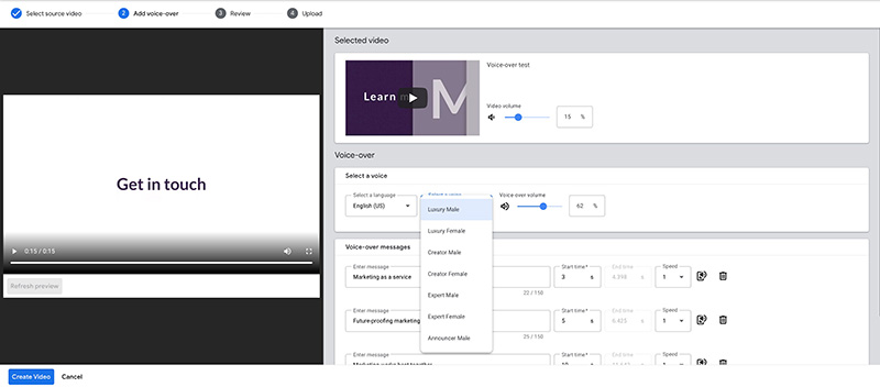 Puhujan äänen voi valita seitsemästä eri vaihtoehdosta ja vasemmalla voi kuunnella eri vaihtoehtoja esikatselunäkymässä.