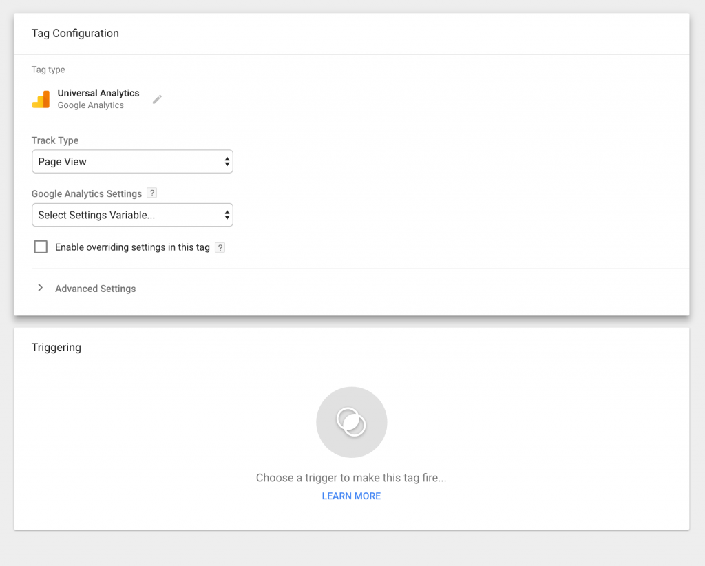 GTM on siitä hieno järjestelmä, että yksinkertaisten tägien lisääminen on erittäin helppoa ja nopeaa. Esimerkiksi Google Analytics -tägin luomista varten löytyy valmis pohja, johon pitää vain täyttää tarpeelliset tiedot. Tämän lisäksi jokaista tägiä varten on asetettava ”trigger”, joka määrittää, milloin tägi on aktiivinen. Sen asettaminen on myös varsin intuitiivista.