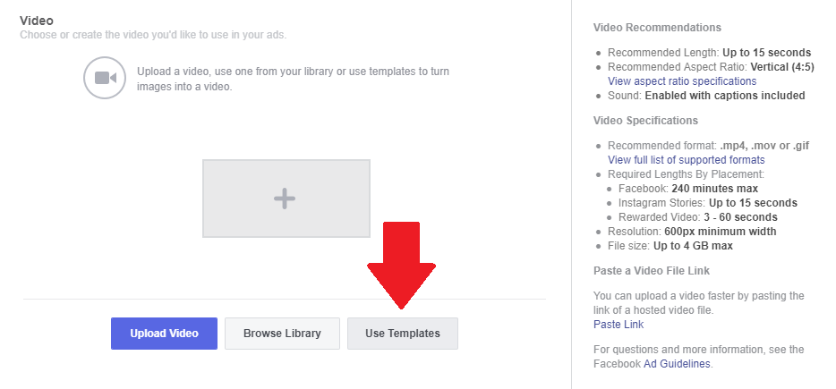 Luo videoita helposti still-kuvista ja tekstistä käyttämällä Facebookin Video Creation Kit’iä. Löydät työkalun Mainostenhallinnasta valitsemalla muodoksi yksittäisen videon ja sen jälkeen “käytä malleja”.