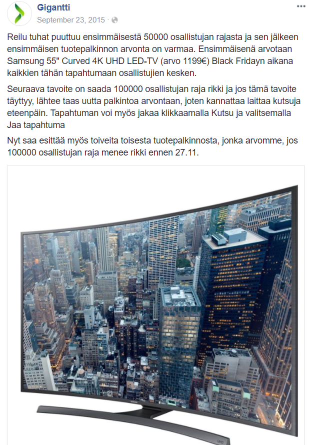 Gigantti aktivoi ihmisiä osallistumaan Black Friday -aiheiseen Facebook-tapahtumaansa kilpailujen avulla. - Tarjoa oheistuotteita. Black Friday -mainosten tarkoituksena on ohjata käyttäjä ostoksille ja lisätä ostokertojen määrää, oli kyse sitten verkkokaupasta tai kivijalkamyymälästä. Varmista lisämyynnillä, että saat ostoksista riittävästi katetta. Ehdota esimerkiksi maksutv-kortinlukijaa television ostajalle tai vastamelukuulokkeita puhelimen ostajalle.