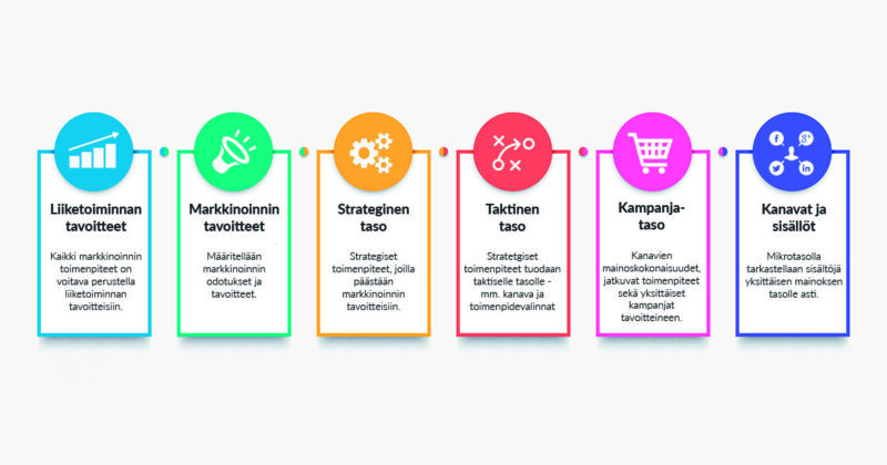 Pitäydy strategisella tasolla strategiassa, kun taas taktisella tasolla voit miettiä kanava- ja keinovalikoimaa, mutta älä keskity yksittäisten mainosten kuviin tai sanavalintoihin. Myös vastuu kannattaa jakaa suunnitteluprosessin läpi optimaalisesti niin, että kaikki hahmottavat kokonaisuuden, mutta pystyvät hallitsemaan oman tonttinsa mahdollisimman itsenäisesti. Kuinka moni toimitusjohtaja ihan oikeasti haluaa vaikuttaa yksittäisen mainosvariaation sanavalintoihin, kun pöydällä olisi varmasti jotain tärkeämpääkin tekemistä…