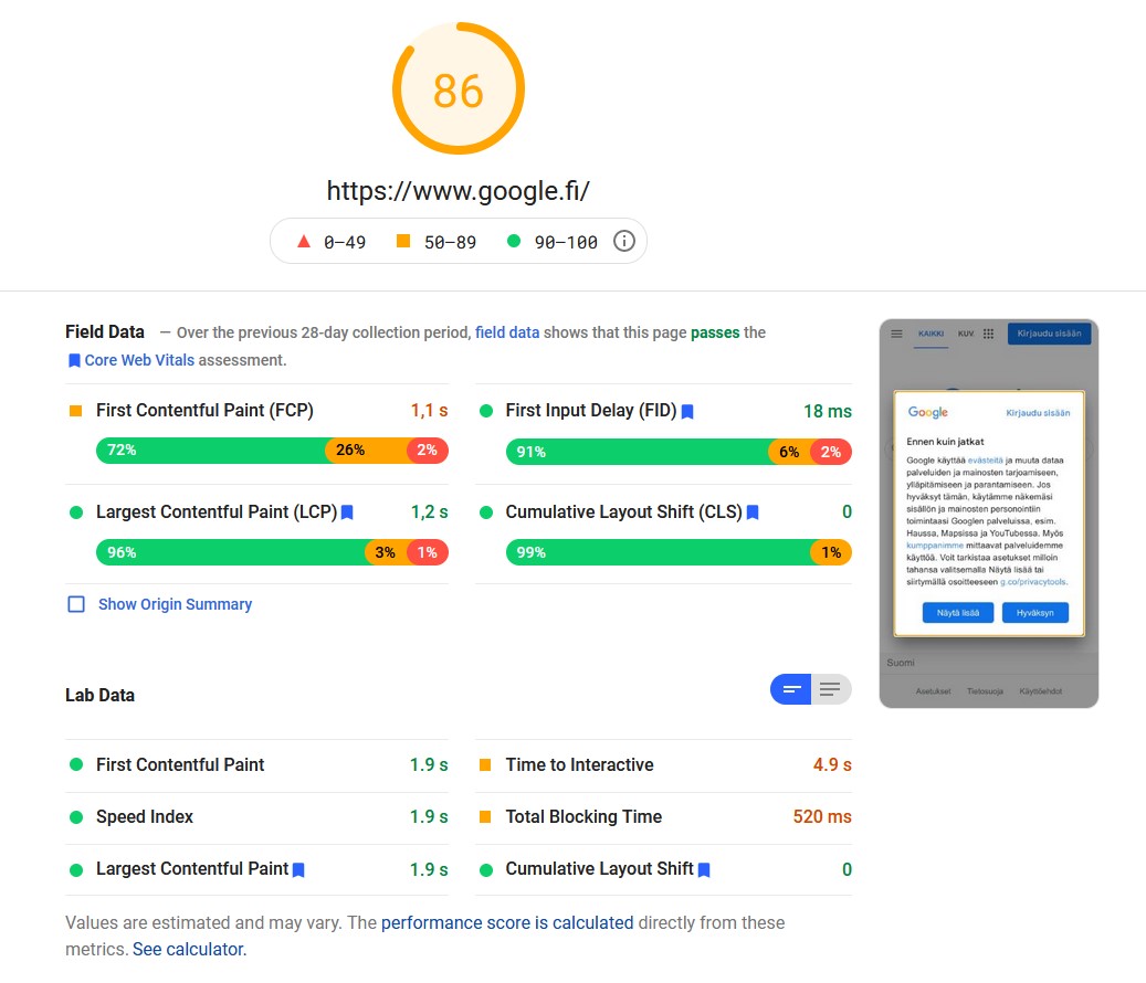 Pagespeed Insights käyttää hyväkseen sekä synteettisiä että oikean maailman tuloksia. Tämä on hyvä työkalu varsinkin nopeaan tarkistukseen ja rajapinnan avulla on mahdollista tehdä jatkuvampaakin seurantaa.