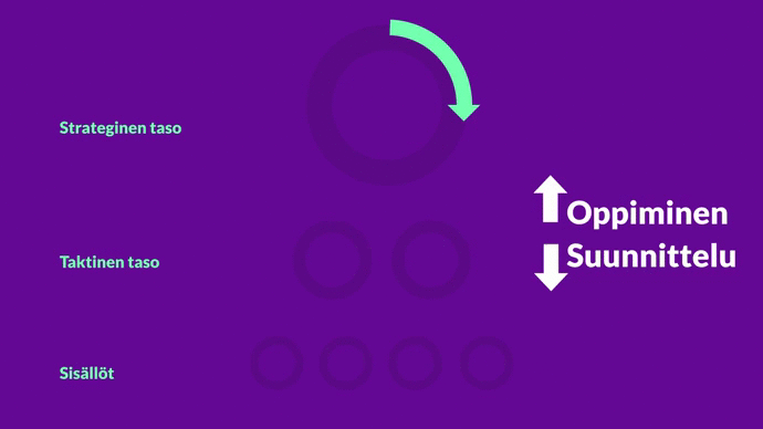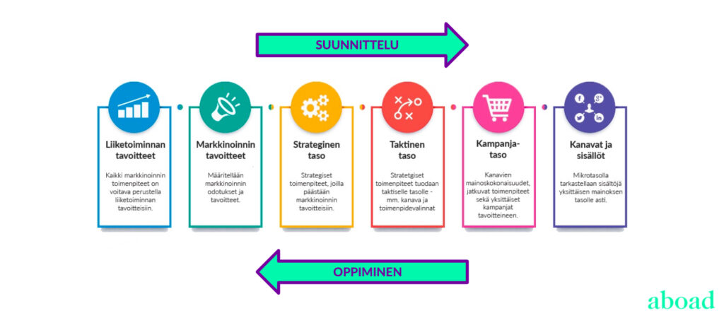 Suunniteluprosessi alkaa ylhäältä alaspäin ja näin ollen kaikki muut tasot perustuvat liiketoiminnan tavoitteisiin. On ensiarvoisen tärkeää, että kaikki suunnittelu- ja oppimisketjun tekijät tietävät liiketoiminnan tavoitteet ja pohjaavat oman toimintansa niihin. Tämä koskee niin markkinoinnin in-house tekijöitä kuin sidosryhmiäkin. Jokaisen työntekijän kohdalla suunnitellessa henkilökohtaisia tavoitteita tai vaikkapa markkinoinnin yhteistyökumppanin tavoitteita määritettäessä, jokainen tavoite tulee miettiä niin, että se edistää jotain liiketoiminnan tavoitteista. Näin tavoitteet saadaan tekemiseen ja käytäntöön muuallekin, kuin vain johtoryhmän vuosipalaverin motivaatio-presentaatioon.