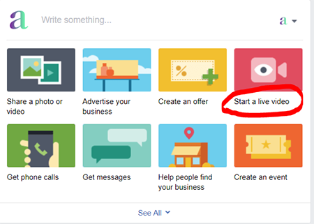 Mikäli käytät Facebookia tietokoneella ja haluat julkaista livevideon brändisi Facebook-sivulla, mene organisaatiosi tai yrityksesi sivulle Business Managerin kautta ja valitse “Aloita livevideo”.