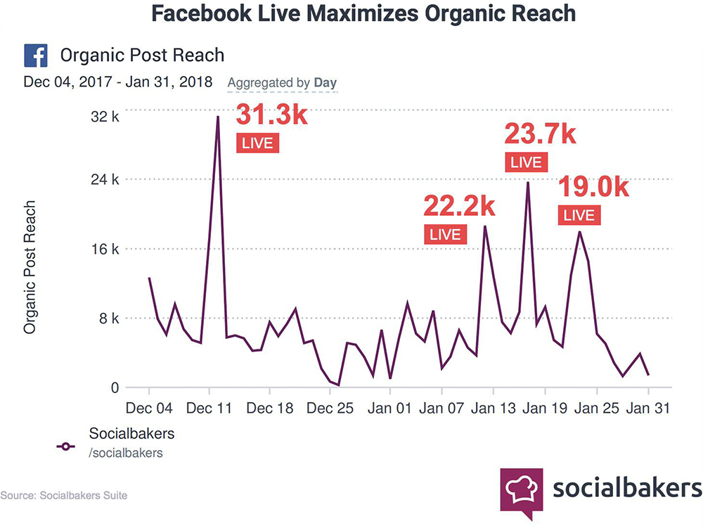 Videon suosio Facebookissa ei ole yllätys – Facebook on jo pitkään kertonut suosivansa videota algoritmeissään. Socialbakersin vastikään toteuttaman testin tulokset kertovat miten viimeisin algoritmimuutos vaikuttaa eri sisältölajien orgaaniseen kattavuuteen. Alla olevasta graafista voidaan tarkastella heidän sisältöjensä orgaanista kattavuutta Facebookissa. Jokaisen Facebook-livevideon julkaisuun ajoittuu moninkertainen kävijäpiikki kaikkeen muuhun sisältöön verrattuna. Kirjoittaja miettii myös minkälaisen näkyvyyden livevideot voisivat saada, mikäli niiden promoamiseen käytettäisiin mediabudjettia.
