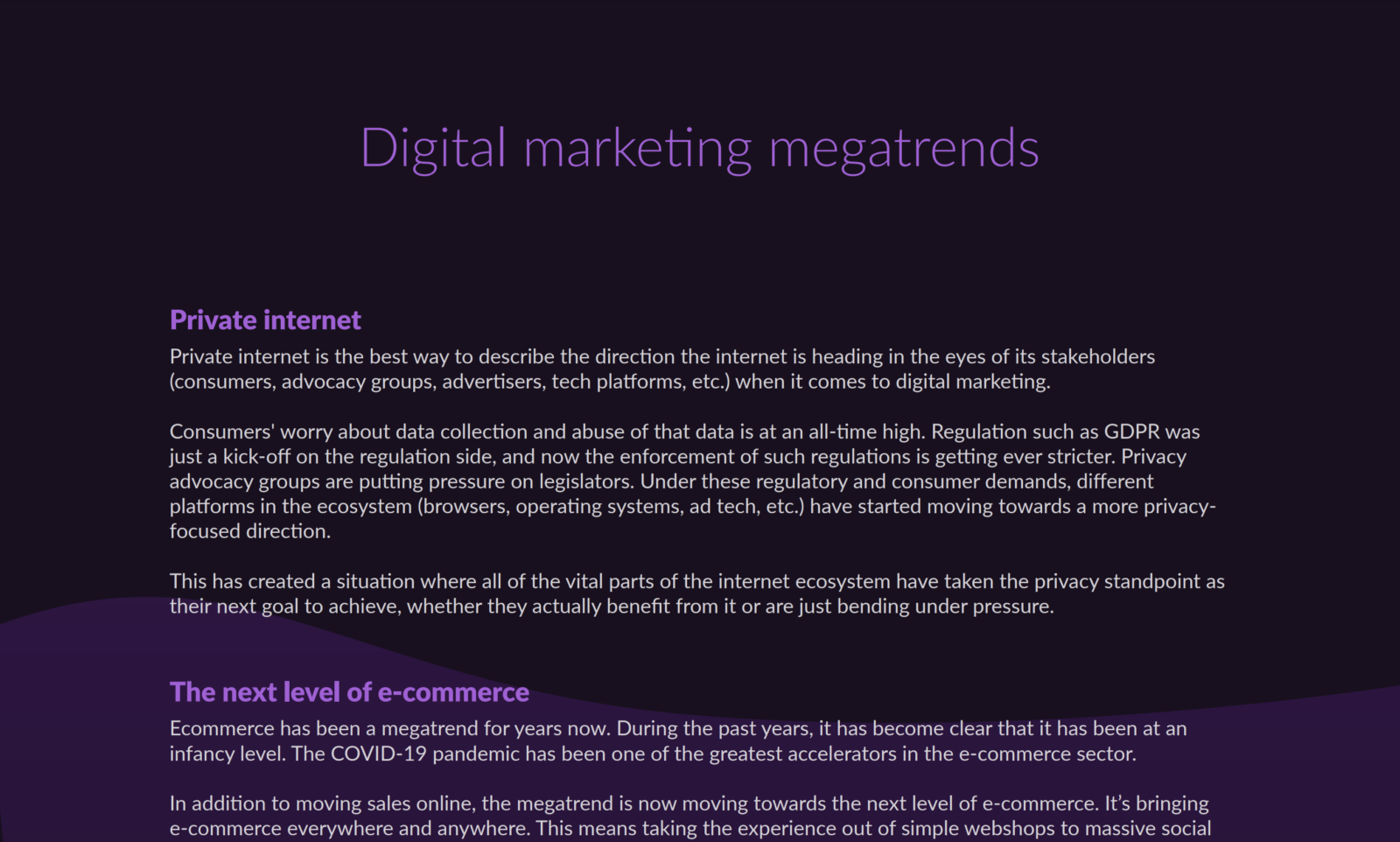 Esimerkkinä tässä käytetään tuottamaamme digitaalisen markkinoinnin tulevaisuusraporttia.
