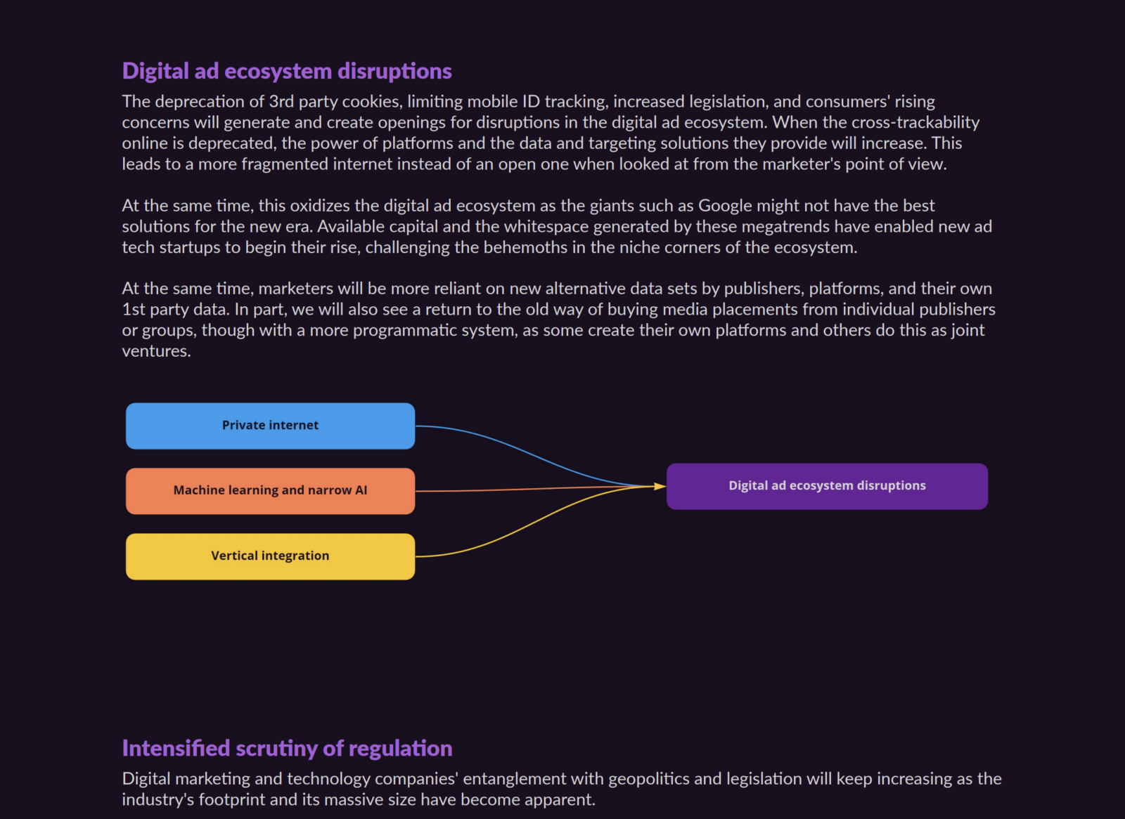 Esimerkiksi yksityisyyteen painottuva Private internet -megatrendi ruokkii teknologiayhtiöiden valtaa, kun siihen sekoitetaan vertikaalisen integraation megatrendi. Näin voidaan nähdä sekä se, että tulevaisuudessa alustat ovat omia saarekkeitaan, kuin myös se, että kaikki lainsäädäntö yksityisyyttä turvaamaan tulee olemaan bensaa tämän kehityksen liekkeihin. Private internet -trendi siis osin heikentää sotii omaa tavoitettaan vastaan.
