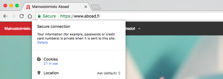 Aboad on myös mukana luomassa turvallisempaa internetiä. Tällä hetkellä rakennamme kaikki uudet verkkosivustomme tukemaan HTTPS-protokollaa, ja teemme töitä saadaksemme myös mahdollisimman monet jo julkaistuista verkkosivustoista käyttämään salattua yhteyttä. Tulevaisuudessa tahtomme on edelleen kehittää verkkosivuja teknisesti ja tietoturvallisesti siten, että asiakkaidemme sivustot toimivat parhaalla mahdollisella tavalla.