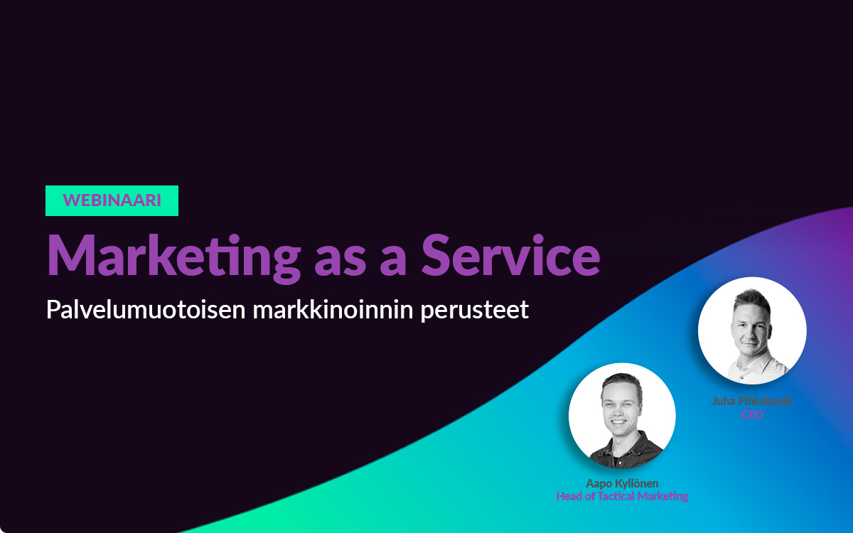 Suositut webinaarimme saavat jälleen jatkoa, tällä kertaa aiheenaan markkinointi palveluna (Marketing as a Service eli MaaS). Ilmoittaudu nyt mukaan webinaariin 21.9.2022 klo 9:00.