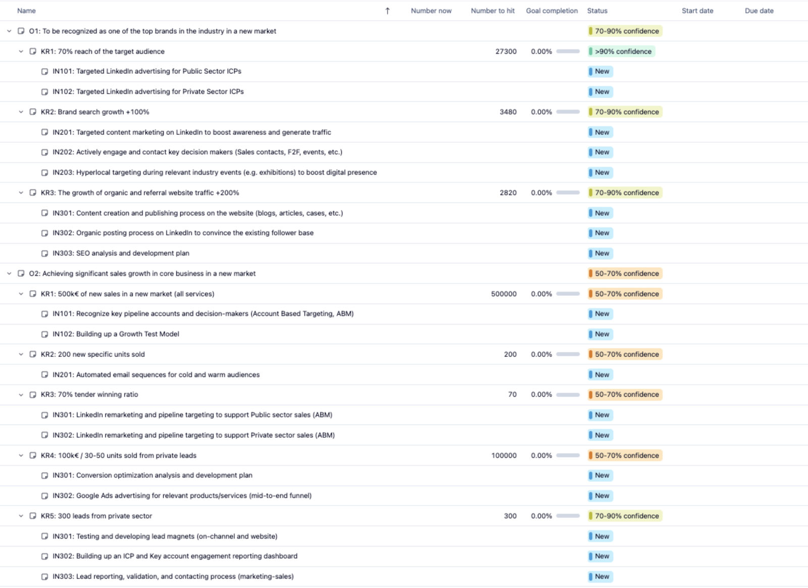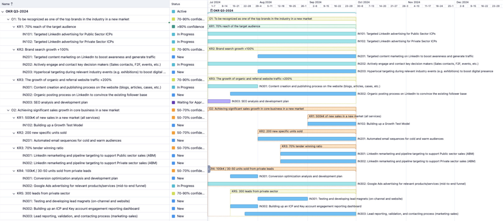 The simple question to follow when planning initiatives is: “What do we need to do to achieve these goals?” By planning initiatives that are directly tied to your OKR, you can maintain a clear line of sight between your marketing activities and your business goals. Initiatives can widely include actions such as paid and organic marketing efforts, digital and F2F actions, and sales activities. The most important thing is that each initiative drives the key metric and the main objective that it’s planned for.